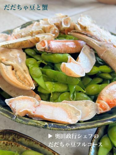 ▲ このだだちゃ豆は、赤澤3号。カニがで〜んとのっかって、豪華!