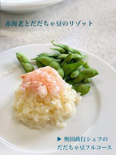 ▲ 好きすぎる。おいしすぎるリゾット。海老や蟹の成分と同じ成分が、だだちゃ豆にはそなわっていることを料理を通じて記憶することができました。正に食育。