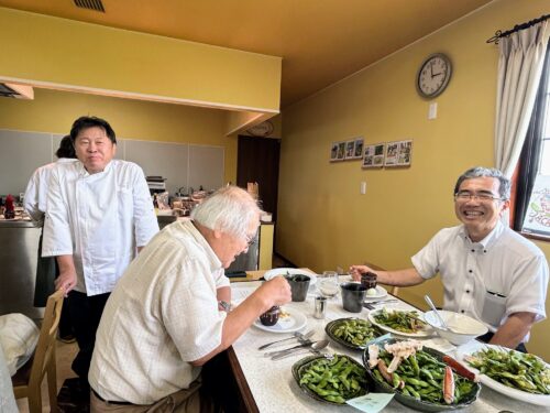 赤澤先生のお話をお聴きしながら赤澤3号をふんだんに食し、江頭先生のお話をお聞きしながら、カニがのっただだちゃ豆をつまむ。しかも、両氏と同じテーブルに御席を賜る栄誉。