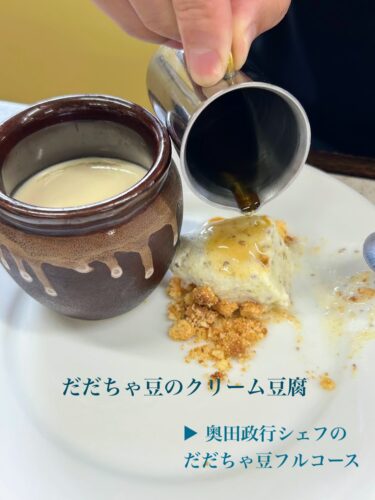 ▲ 壺に入っているのが、だだちゃ豆のクリーム豆腐。だだちゃ豆アイスにかけているのは、みりんです。