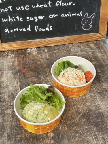 わさび菜のフムス&おからサラダ 手前がフムス、奥がおからサラダ。入山とうふ店さんの販促をお手伝いしています。開発したお惣菜は、とうふを使ってつくるフムス。これが、なかなか好評です。