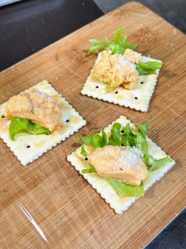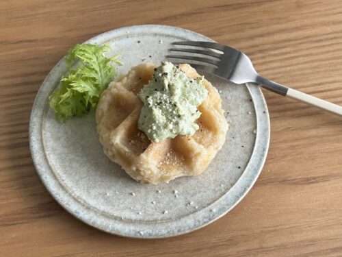 お食事トッフルにわさび菜フムスのトッピング 朝ごはんに食べてもらえるような甘くないトッフルをつくろうと思い立ちました。それに沿えるディップを開発中