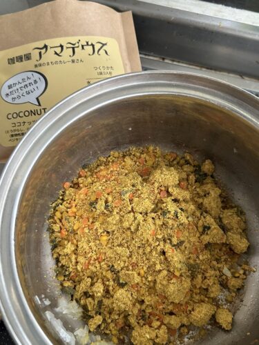 カレーは美瑛の『咖喱屋 アマデウス』のキットを活用しました。ココナッツカレーには皮を剥いた緑豆(ムングダル)を使われていました。ベジタリアンでもOKの豆カレー、ココナッツ風味が効いていました。