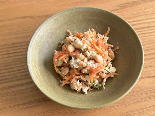 ニンジンの白和え とうふ料理をつくろうと思って試作しました。開けたら直ぐに使えるマルヤナギさんの蒸し大豆も活用。白みそ味に仕上げました。とうふと大豆を入れてるから、親子丼みたいな白和えです。