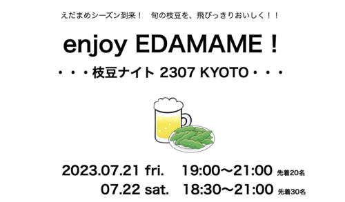 丹波篠山の新種「デカンショ豆」と、産直〜群馬県沼田市の天狗印「みりょく枝豆」を食べ尽くそう! ただいま、参加申込受付中です。 7月21日(金)19:00〜21:00/先着20名さま/7.18 午前中の受付迄 7月22日( … 続きを読む 企画イベント「枝豆ナイト2307」開催します!