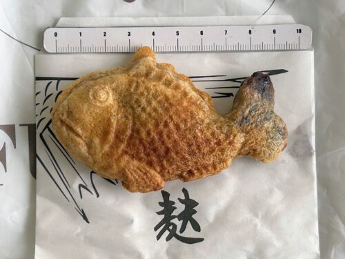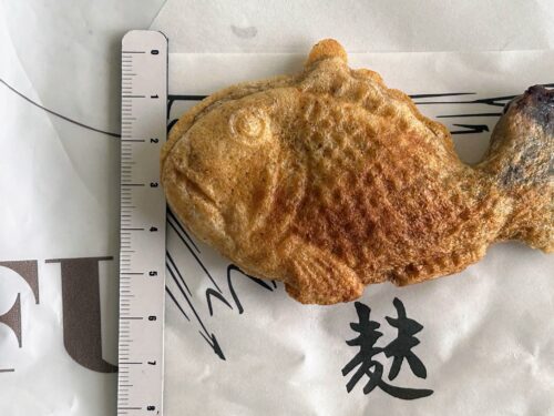 手のひらサイズの鯛やきを手にしたら、つい、サイズ測定したくなりました。